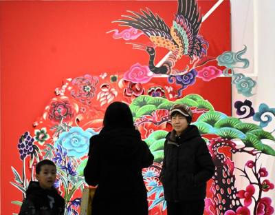 4月1日,在意大利博洛尼亚,人们在第62届博洛尼亚国际儿童书展中国插画展区参观。