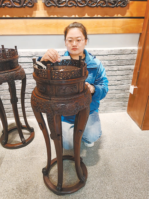 去年,李纪洁参加了北京市第六届职业技能大赛,获得可移动文物保护项目的银牌。获奖后,她参加了文物数字化培训。“文物数字化为家具修复带来了新方向。”李纪洁兴奋地开启了数字技术与文物修复融合的思考,“比如数字雕刻,我们可以用扫描仪将缺失的件扫描出纹样,通过3D打印技术进行复刻。这样就可以避免多次拆装对文物造成的损害,减少人工拼合的难度和时间。”