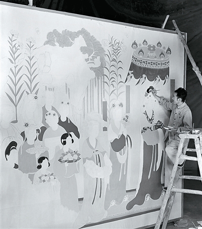 1955年7月20日,段文杰在莫高窟130窟甬道临摹壁画。新华社发