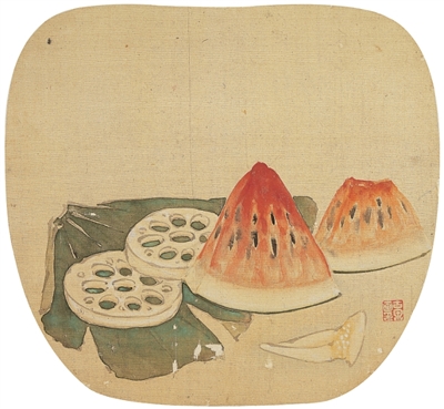 来自清代宫廷的女画家缪嘉惠以工笔和小写意画法见长。她笔下的《山水花卉蔬果图》册之一,便以西瓜为主角,用色清丽。画家对西瓜纹理的处理手法参合了西画的透视技法,可能与她在宫廷中受到西洋画家作品的影响有关。