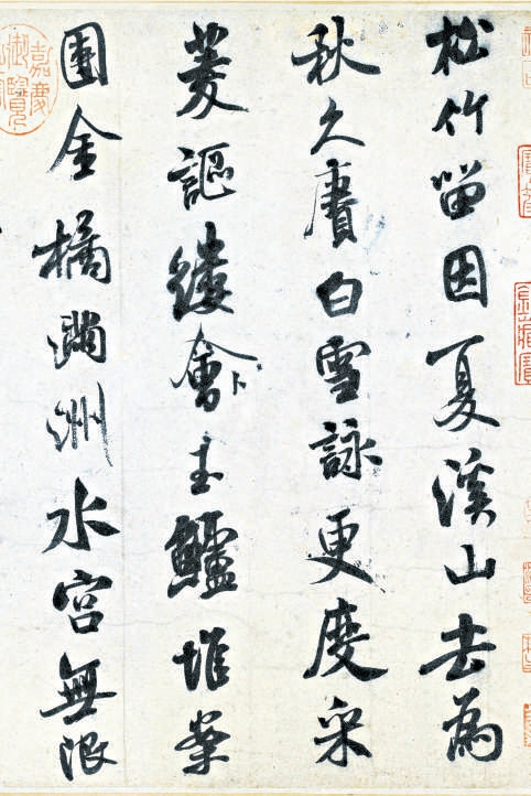 《三希堂法帖》所刻《苕溪诗帖》,笔锋出入的细腻和姿态仍然是精彩的看点,但是,遗憾的是,对字势和章法的调整成为了“败笔”。比照真迹,此帖每个字的字势都非正局,错落自然中完成字与字之间的气脉衔接。这既是米芾书法理念的核心要旨,也是米字最为打动人之处。《三希堂法帖》中将很多字势都调整为平正之局,把米字的奇趣泯去了大半,这恐怕不是刻工所能擅自决定的,当是编排者有意斟酌考量的结果,甚至应该得到了乾隆的认可,这种“中和化”的调整应与当时官样书风以及乾隆的审美趣尚相趋近。一些明显的收放与字组关系被匀整化处理,如“无限”二字,距离、取势都发生了改变,原本紧密的字间关联被弱化了许多。再如“白雪咏”和“更度采”在墨迹本中分别形成了两个笔墨节奏的字间关系,前者字形由小渐大,后者字形渐趋收敛,与前一行的交叉变化关系也很清晰。《三希堂法帖》中,因为整体章法做出了较大调整,打乱了每一行的格局,使得原本鲜明活泼的对比关系荡然无存。这种调整实际上使得该帖的范本价值大打折扣;而且,这种调整思路并非个例,《临沂使君帖》《陈揽帖》《烝徒帖》以及其他书家书迹都是如此。