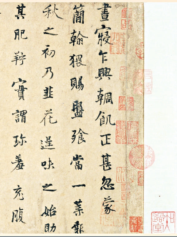 同样章法变动明显的还有被誉为“天下第五行书”的《韭花帖》。这件作品在笔画和字的形态上的镌刻可以称得上传神,对于小行书如“味”字等字,字内笔画细微的衔接都刻画得非常自然生动。但在章法上,《三希堂法帖》中不仅将原本上下有错落的前两行变为完全平齐,字与字之间的关系也与墨迹本大相径庭,如“秋”字原本为一列之中的首字,在由帖转为刻石的过程中却被改变顺序成为第二个字,使得一列之中整体的效果与墨迹本相比大打折扣。再从整体来看,《韭花帖》墨迹本与《三希堂法帖》中的版本虽然都呈现松动的效果,但在墨迹本中,则是松中有紧,变化丰富。三希堂的版本并没有注意保留这一点,而是近乎均匀的松动,舍弃了如“载切”“谨修状陈”这种松动中的内在关联,忽略了整体中部分的巧妙变化,而将注意力放到单个字的精雕细琢上,这或许也是《三希堂法帖》对于当今观赏者的一点局限性所在。