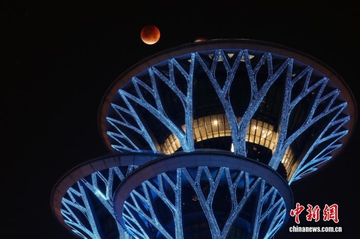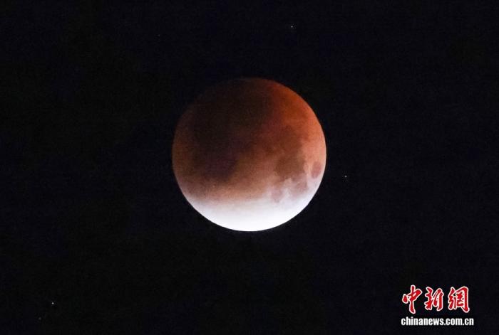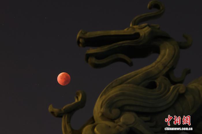 资料图:9月8日凌晨,江苏南京,罕见的“红月亮”现身城市上空。9月7日午夜至8日凌晨,月全食天象亮相苍穹。中新社记者 泱波摄