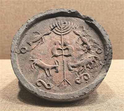 遗址展示馆内,战国时期树木鸟兽纹瓦当、汉代“富乐未央,子孙宜昌”铭文砖、北魏角抵瓦当等建筑构件,诉说着古城的千年繁华。树木鸟兽纹瓦当正中有一株挺拔的树,弧形树冠向上舒展,枝叶两侧对称雕刻振翅飞鸟,树干上的两只猴子呈攀缘姿态相对而立,树根部对饰两只山羊,造型质朴。内蒙古师范大学北疆文化研究中心主任陈永志介绍:“树冠飞鸟、猴子攀树题材源自中原地区灵魂升天、王侯将相等文化元素,而对羊纹又具有草原游牧民族风格。这件瓦当生动体现了中原文化与北方草原文化的交融。”