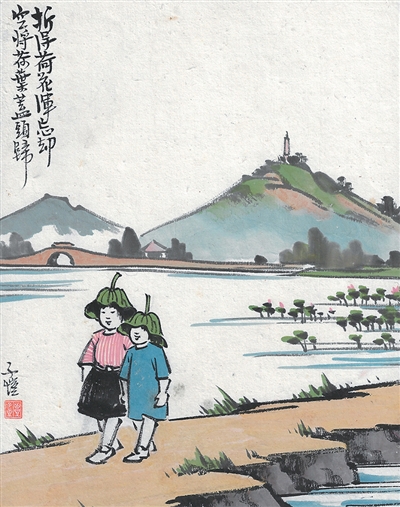 折得荷花浑忘却 空将荷叶盖头归(中国画)丰子恺作