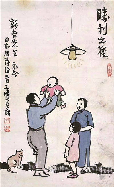 1945年8月10日,当电台里传来日本接受《波茨坦公告》全面无条件投降的消息时,重庆的大街小巷人们奔走相告,庆祝胜利的鞭炮声此起彼伏。当时避居山城的丰子恺,有感于此,绘制了《卅四年八月十日之夜》——父亲喜不自禁,将孩子高高举过头顶,象征光明和胜利的灯光照亮画面。丰子恺通过一个家庭的温暖瞬间,描绘了抗战胜利之夜的人民心声。随之,丰子恺在此基础上再绘《胜利之夜》,画面中的紫衣男孩换作笑容温婉的母亲。9月2日,日本代表在美军“密苏里”号军舰签署无条件投降书,丰子恺即作《炮弹作花瓶万世乐太平》——桌面上的炮弹壳成为花瓶,寓意和平的荷花插入其中,两个儿童玩具倚放其旁,展现了他对世界和平的美好祈愿。