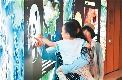 游客在大阪世博会中国馆与虚拟动物互动。