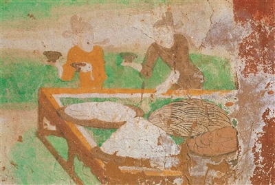 中唐 莫高窟第159窟西龛西壁供桌上摆着四盘面食食品,左上盘为胡饼 (敦煌研究院官网)
