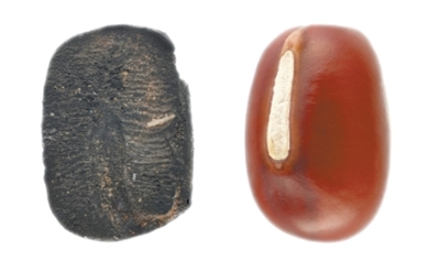 小高遗址出土的炭化小豆(左)与现代小豆(右)。陈雪香供图