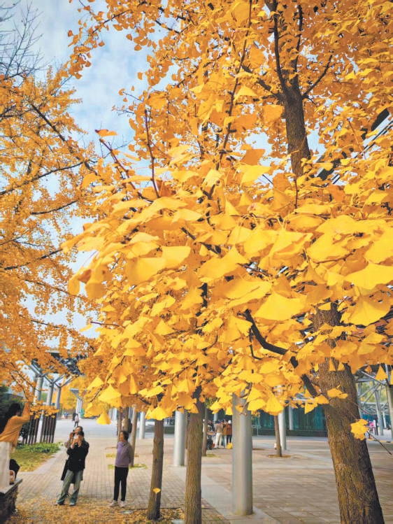 奥森南门金黄的银杏引来众多市民打卡拍照