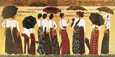 1978年,在云南省西双版纳傣族自治州采风的乔十光,于澜沧江畔观看泼水节龙舟竞赛。他被三五成群、扎着高高发髻的傣家妇女吸引,由此创作了漆画《泼水节》。画中人物形象,皆出自乔十光在当地的百余幅素描写生。