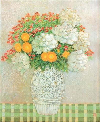 庞薰琹1934年创作的水彩画《地之子》以江南大旱为背景,描绘了一个农民家庭的悲剧。作品造型简练、色彩质朴,是装饰性风格中承载民族苦难与觉醒意识的代表作。其晚年的油画《瓶花》,巧妙融合西方油画的色彩表现与东方意韵。画面上,瓶器、桌布纹路细致,装饰意味浓郁,与花朵鲜活的样貌相映成趣。