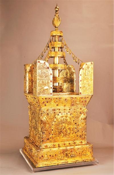 迄今,大报恩寺遗址已发掘出土1.2万余件文物,除了藏于地宫的珍宝,还有多彩的琉璃构件等。其中,鎏金七宝阿育王塔是目前中国境内出土的体量最大的阿育王塔。它由下部塔座和上部塔盖两部分组成,通高1.17米、最大边长(塔座底板)0.45米。塔内部以檀香木作骨架,表面为银皮,通体鎏金,塔体上凿有452个圆孔以镶嵌珠宝,分金、银、琉璃、砗磲、玛瑙、珍珠、玻璃七类。塔身还发现了20条铭文,共计300余字,主要记述了施主的身份和姓名、捐赠物品的种类和数量等。