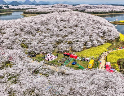 碧水青山、绝壁古镇、吊脚悬楼、如织游人与烂漫春花相映成景,构成一幅美丽的生态画卷